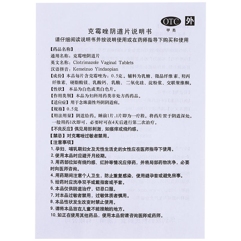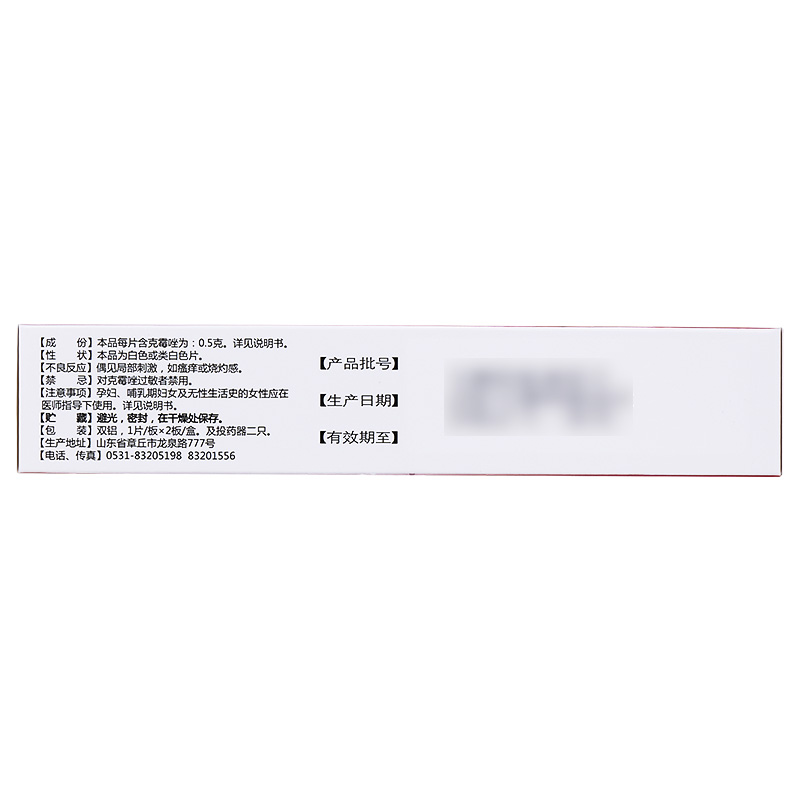 本品每片含克霉唑为:0.5克。辅料为乳、微晶纤维素、羟丙纤维素、硬脂酸镁、乳酸钙、乳酸、二氧化硅、淀粉浆、交联聚维酮。