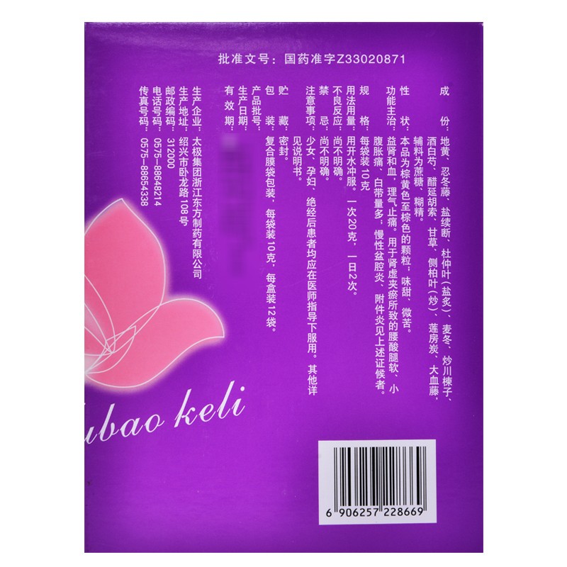 妇宝颗粒的主要成分包括地黄、忍冬藤、续断、杜仲叶、麦冬等多种成分,具有益肾和血、理气止痛、疏风通络的功效,可以用来治疗女性常见的盆腔炎和附件炎等临床疾病。一般来说,如果女性在来月经以前就服用该药物治疗妇科疾病,在经期是可以正常服用的,一般是不会导致月经量和月经周期改变的。妇宝颗粒具有益肾和血,理气止痛的功效,常用于女性患有慢性盆腔炎、附件炎等症状。患者在服...